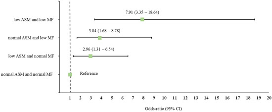 Figure 2 illustrates the risk of having depressive symptoms according to ASM- and MF-based subgroups. Individuals with low ASM/normal MF (OR = 2.963, 95% CI = 1.318–6.538, p = 0.019), normal ASM/low MF (OR = 3.843, 95% CI = 1.679–8.797, p = 0.002), and low ASM/low MF (OR = 7.907, 95% CI = 3.354–18.640, p < 0.001) had a higher risk of depressive symptoms compared to individuals with normal ASM/normal MF (OR = 1).