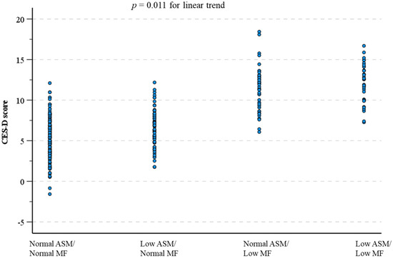 Furthermore, CES-D score was incremental (p < 0.011) in the order of normal ASM/normal MF, low ASM/normal MF, normal ASM/low MF, and low ASM/low MF, respectively, as shown in Figure 3.