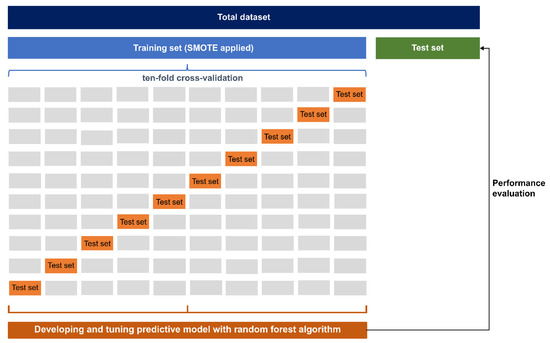 For the algorithm, random forest was used. In general, the decision tree model has the advantage that variable importance and classification mechanisms can be intuitively known and the computing cost is low. However, the decision tree is rarely used as an algorithm for solving problems in practice since it has the crucial problem of being vulnerable to overfitting. Random forest is the ensemble model to compensate for the shortcomings of this decision tree [29]. It maximizes predictive power when new data (i.e., test set) are given rather than used for training by minimizing the overfitting of decision tree. Thanks to this advantage, random forest has been used as a practical problem-solving algorithm in various fields [30,31].
