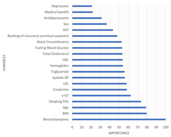 The AUC, which is the most preferred indicator of the prediction model, was 0.818 (Figure 2). In addition, overall accuracy was 0.832, sensitivity was 0.600, specificity was 0.833, negative predictive value was 0.999, and positive predictive value was 0.007. The variable with the highest importance was the history of taking benzodiazepines, followed by BMI, age, and history of taking sleeping pills (Figure 3).