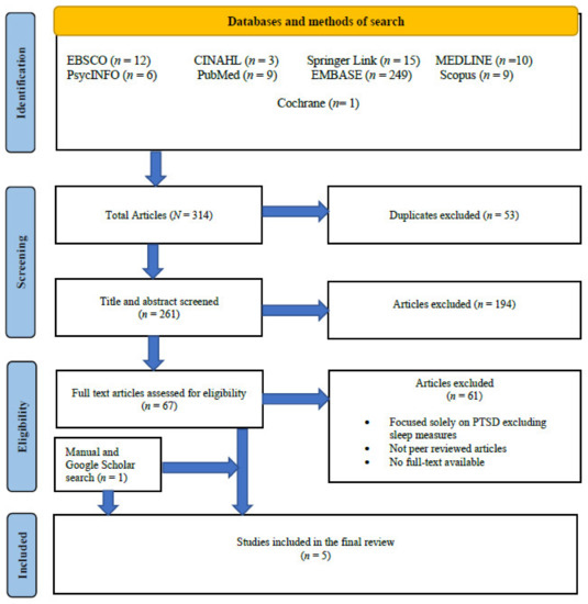 A total of 314 studies were identified for screening by title and inclusion criteria. Following the exclusion of 53 duplicates, a total of 194 studies were further screened by title and abstract and were excluded for not meeting the inclusion criteria. Most of these articles did not address the prevalence of sleep disturbances, were not peer reviewed, fires were not due to natural disasters, and the study sample did not include the general public. Following this, 67 studies were screened by abstract and full article, of which, a further 61 were excluded leaving six studies. One additional study was located by checking reference lists and Google Scholar search. A total of seven studies met the inclusion criteria. However, two studies were excluded following correspondence with the authors in May 2021 [38], due to data overlap in two different papers [39]. Five studies met the inclusion criteria, for which there was 100% inter-rater agreement (see Figure 1).