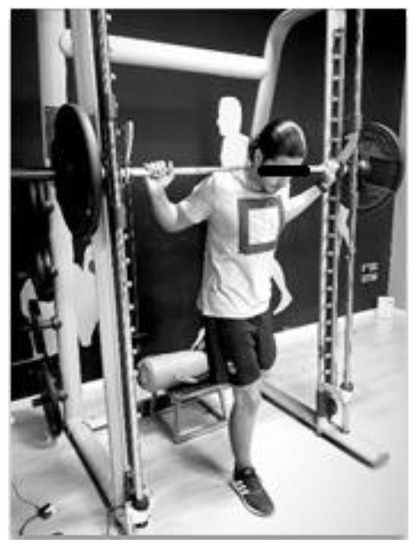 In the first session, height was measured with a Seca stadiometer (Hamburg, Germany), body mass and fat percentage were measured with a Tanita BC 351 Scale (Tanita Corporation, Tokyo, Japan), and the load to be mobilized with the execution velocity was calculated. Before running the test with incremental loads, the weight to be moved was determined, and a standard 8-min warm-up was performed, which consisted of a 5-min run between 9 and 11 km/h and 1% inclination on the treadmill, followed by joint mobility and progressive runs. The initial load of the test was 50 kg for the bilateral squat and 25 kg for the unilateral squat. The weight was progressively increased by 10 and 5 kg, respectively, with 3-min rests after each set, until values close to or below 0.59 m-s−1 were obtained for the mean propulsive velocity (MPV) in the concentric phase; this speed value was chosen in order to determine the RM in a valid way [19]. The MPV differs from the mean velocity (MV) in the braking phase since the MPV eliminates this phase, and it is with the MPV that the percentages of the RM were associated [4]. Subsequently, the load to move was determined based on linear regression. The bilateral squat exercise was performed with a 90-degree flexion (corroborated by a cap for each person, which did not allow descending beyond these degrees, for both exercises), with the bar over the shoulders and facing forward. The eccentric phase was performed in a controlled manner, demanding maximum velocity in the concentric phase of the movement without taking the toes off the ground (Figure 1). The same protocol was used for the unilateral squat, but the leg was passively isolated and raised on a support that allowed the evaluated leg to perform 90-degree flexion, keeping this height for the whole movement (Figure 2). The entire protocol was performed on a Smith machine, which was chosen to improve the accuracy of the linear transducer (Chronojump, Barcelona, Spain) MPV measurement, restricting movement in the vertical direction. In this same session, participants were familiarized with the CMJ and the TAT.