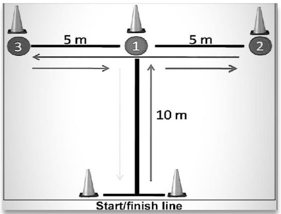 - Raya, M.A.; Gailey, R.S.; Gaunaurd, I.A.; Jayne, D.M.; Campbell, S.M.; Gagne, E.; Manrique, P.G.; Muller, D.G.; Tucker, C. Comparison of three agility tests with male servicemembers: Edgren Side Step Test, T-Test, and Illinois Agility Test. J. Rehabil. Res. Dev. 2013, 50, 951–960. [Google Scholar] [CrossRef]