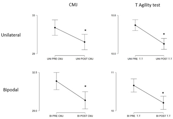 On the other hand, the performance in the T-agility test increased, showing a statistical significance through the test (p < 0.05 in both groups), and the effect size was 1.3 (long) in the unilateral group and 0.99 (moderate) in the bilateral group.