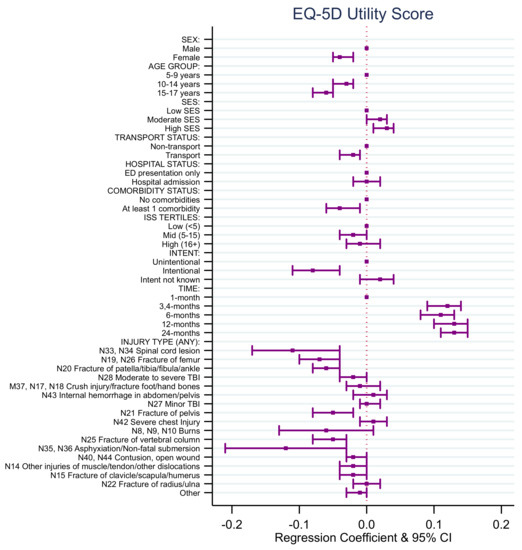 Dipnall, J.F.; Rivara, F.P.; Lyons, R.A.; Ameratunga, S.; Brussoni, M.; Lecky, F.E.; Bradley, C.; Beck, B.; Lyons, J.; Schneeberg, A.; et al. Health-Related Quality of Life (HRQoL) Outcomes Following Injury in Childhood and Adolescence Using EuroQol (EQ-5D) Responses with Pooled Longitudinal Data. Int. J. Environ. Res. Public Health 2021, 18, 10156. https://doi.org/10.3390/ijerph181910156