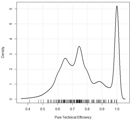 Density function of pure technical efficiency in 173 hospitals in the Spanish National Health System. Source: Prepared by the authors.