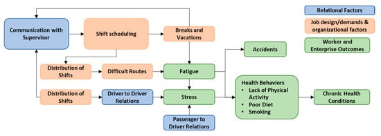 The interviews and focus groups were conducted, audiotaped, and transcribed in Spanish. The transcriptions were then translated into English. The English transcripts were coded using NVivo software (Version 11, QSR International) and were then thematically analyzed []. We used a multi-stage coding process that included both predefined and emergent codes in a two-step process: we used a pre-defined coding tree based on the Harvard Center for Work, Health, and Well-being’s conceptual model []. New codes were added inductively to the coding tree as new themes arose in the data. Codes were structured in the coding tree under the following ‘parent codes’ which included: working conditions (e.g., shifts, scheduling, vacations, routes, compensation, benefits, physical environment, psychosocial work environment, promotions), job demands (e.g., alertness, workload, sedentary work), utilization of company resources and benefits (e.g., gym), safety (e.g., practices, regulations), worker health and well-being (e.g., mental health, stress, diet, chronic health conditions, health behaviors, fatigue/sleep), workers’ life outside of work (e.g., financial stressors, second jobs), enterprise outcomes (e.g., absenteeism, tardiness). Some of these codes also had additional child (sub-)codes. For example, child codes in the ‘psychosocial work environment’ included: supervisor support, work–life/family balance, violence and harassment, relationships with colleagues, relationships with passengers, and communication. Relationships between codes were then mapped using the ‘relationships function’ in NVivo. This function in the more recent version 11 of NVivo allows the coding of a special type of ‘relationship node’ that provides a connection between two codes []. These relationships between codes can then be displayed visually using the relationship mapping function, in NVivo. For example, a relationship between specific working conditions and health outcomes can be mapped (e.g., shift schedules impact the distribution of shift; the distribution of shifts can result in some drivers being required to drive the more difficult routes which take longer to complete, more often; this can then result in driver fatigue due to limited time to rest and sleep; fatigued drivers have limited time to exercise and tend to select pre-packaged or fast food options; these poor health behaviors were reported to result in higher incidences of chronic health conditions). We used this relationship map–generated from NVivo–to create a map of themes (as displayed in Figure 1). From these data, we developed a model linking working conditions and other organizational factors with drivers’ safety, health, and well-being.