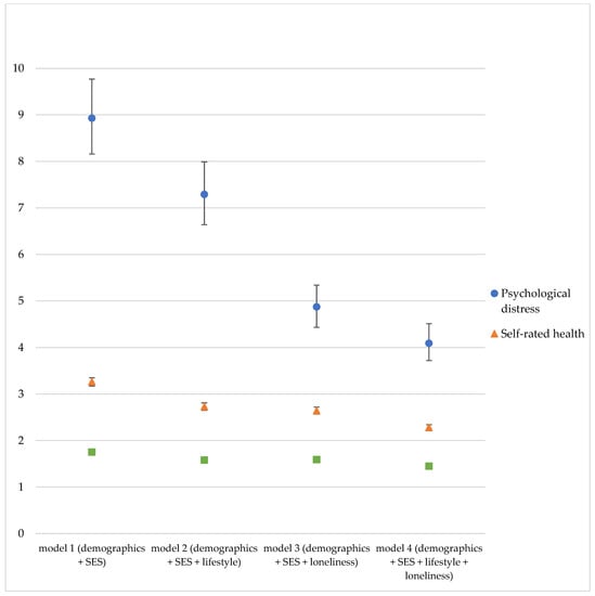 When chronic disease was the outcome, the RR for the lowest vs. highest SES group decreased by 21% with the addition of loneliness and 40% when the model was adjusted for lifestyle-related factors and loneliness (Table 2). Similarly, for self-rated health, the RR for individuals in the lowest SES quartile was reduced by 27% with the addition of loneliness. With both lifestyle-related factors and loneliness, the RR for the lowest (vs. highest) SES group was reduced by 43%, from 2.73 to 2.28. For psychological distress, loneliness accounted for a 51% reduction in the OR for the lowest vs. the highest SES group. Together, loneliness and lifestyle resulted in a reduction of 61% (Table 2 and Figure 1). As a robustness check, we ran our models with each of the SES variables separately, which yielded similar results, see Tables S6–S9.