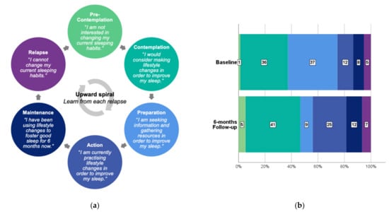 (a) Stages of Change Model of behavioural change []. (b) Students’ (n = 75) attitudes towards sleep behaviours before and 6 months after completion of a sleep and circadian education course.