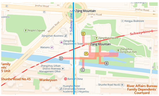 Here, we chose Zhengzhou Zijing Mountain subway station (see Figure 1; this map can be accessed at: https://lbs.amap.com/api/javascript-api/example/map/map-english/ (accessed on 23 September 2021)), which is the largest transfer subway station of Line 1 and Line 2 in Zhengzhou, China, with a high passenger flow every day, as the prototype to build a VR subway fire escape scene using SketchUp and Unity3D, with 1:1 scale of the real station [33] (see Figure 2). There are four floors in Zhengzhou Zijing Mountain subway station. Level-1 is the transfer floor, Level-2 is the concourse level, Level-3 is the platform floor of Line 1, and Level-4 is the platform floor of Line 2.