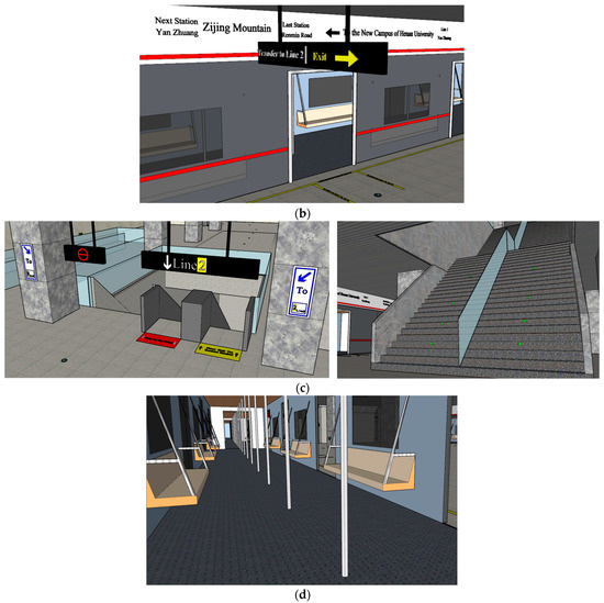 A 3D model screenshot of Zijing Mountain subway station in SketchUp, 1:1 scale of the real station. (a) The exterior view of the 3D model of Zijing Mountain subway station. (b) Guide Signs in the subway station. (c) The stairway in the subway. (d) The interior view of the subway car.