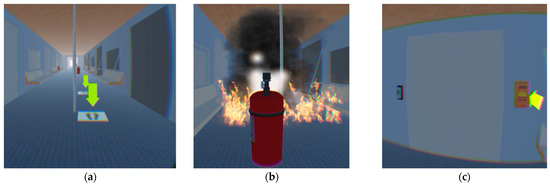 In order to make participants familiar with the virtual experiment operation before the formal virtual fire escape experiment, we first developed a virtual teaching and practice scene, which can teach and practice participants’ movement, the use of fire extinguishers, and the use of the emergency door opener, etc. in the virtual environment (see Figure 3).
