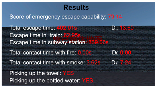 According to the formula description on emergency escape capability in Section 2.3.3 in this paper, when each participant finishes his or her virtual fire escape, the system will automatically show his or her detailed escape score (See Figure 4).