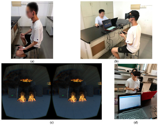 Formal experiment phase: After the virtual practice, participants wore a PPG and EDA sensor and stayed calm for 2 min (see Figure 5a). Then, participants put on an Oculus DK1 (see Figure 5b) in order to escape in the virtual subway fire scene (see Figure 5c), with a Microsoft Xbox Elite joystick in hand. Meanwhile, participants’ SC and HRV data were real-time recorded by ErgoLAB V3.0, in the 2 minutes’ baseline period and the whole virtual fire escape period (see Figure 5d). During the whole escape process, participants were not told to notice any evacuation signs. After the escape was finished, participants needed to fill in a post-questionnaire (see Appendix A), which included their sense of reality, immersion, and nervousness in the virtual fire escape scene; their VR experience, degree of familiarity with the Zijing Mountain subway station, etc.