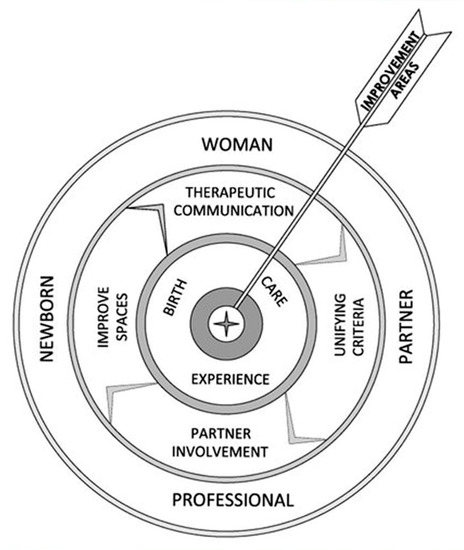 The themes that emerged when describing the experience of childbirth and care constitute the areas for improvement proposed by the participants, and have been represented in Figure 2. This figure shows: in the outer layer, the participants of the hospital delivery experience; in the intermediate layer, the areas of improvement described by the participants, and in the inner layer, the processes in which said improvements have to be applied. The three layers interrelate with each other for a positive hospital birth experience.