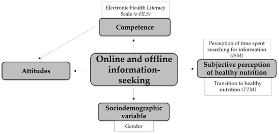 During the creation of the theoretical concept (Figure 2) the connections between university students’ online and offline information-seeking related to healthy nutrition were analyzed in relation to the subjective perception of healthy nutrition, and the competence of health literacy and attitudes towards healthy nutrition. As a control variable, the sociodemographic variable, distribution by gender, was included. The relationships among the components of the theoretical concept were analyzed using an examination of statistical relationships.