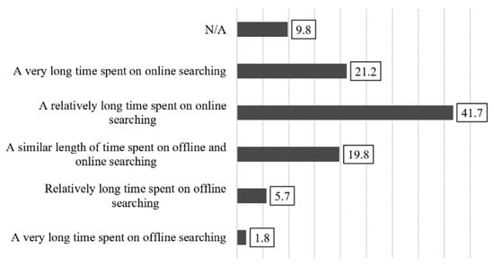 Figure 3 shows the perception of the time spent on online and offline platforms during information-seeking for healthy nutrition. Some 41.7% of the university students surveyed spend somewhat more and a further 21.2% spend considerably more time doing online searching. A total of 19.8% of respondents think that they spend equal amounts of time seeking information on- and offline. Only 7.5% of university students search for information browsing traditional sources, with 5.7% of them spending slightly more, and 1.8% spending far more time doing this activity. In addition, 9.8% of the students surveyed did not respond or were unable to assess the question.