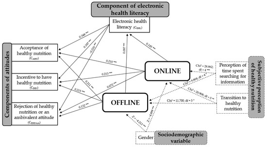 The statistical relationships between online and offline information-seeking attitudes related to healthy nutrition are outlined in the theoretical concept in Figure 5.