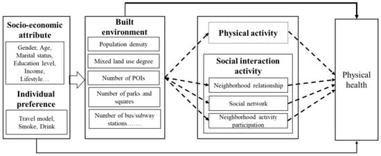 The path between the built environment and individual health is complex [66], with not only direct effects but also indirect effects through the mediating path. Existing studies mostly explore the mediating role of physical activity. Insufficient physical activity has been identified as the fourth-highest risk factor leading to death globally, causing about 3.2 million deaths every year [67]. Active participation in physical activity, even moderate physical activity, can have a significant positive effect on maintaining good physical condition [68]. Many studies have been done on the mediating effect of physical activity, showing that the built environment can reduce the probability of occurrence of physiological diseases such as obesity, hypertension, and diabetes by promoting physical activity, thereby affecting people’s health [19,62]. For example, scholars have found that in the context of low population density in Western developed countries, increased population density shortens the distance between daily travel destinations and can promote transportation modes such as walking and cycling so as to increase physical activity, reduce obesity, and improve physical health [57]. Evidence from California also showed that residents in neighborhoods with higher density, land use mix, street connectivity, and safety spent more time in physical activity and had lower obesity prevalence [69]. A recent before and after study of downtown Vancouver demonstrated that opening urban greenways and reallocating road space from motor vehicles to other activities can increase active travel and physical activity time so as to improve health conditions [70]. However, the research also showed that while high-density neighborhoods can encourage active transportation, neighborhoods that have high population density also have a higher level of economic development. In areas with high economic development, people usually walk less and have more opportunities to consume unhealthy food, and the living environment is also noisier, which can increase the risk of obesity and mental illness [71].