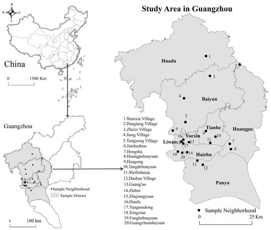A multistage stratified probability proportionate to population size sampling technique (PPS) was adopted to extract samples. PPS is a probability sampling proportional to the size of the scale. It is often used in two-stage sampling. In the first stage, according to the sixth national population census in China, we extracted the original data reflecting the social attributes of the aging population in Guangzhou, such as demographic characteristics, socioeconomic characteristics, and housing conditions, divided the social aging areas in Guangzhou into six types using ecological factor analysis and cluster analysis (including concentrated distribution areas of older adults in old neighborhoods, in government agencies, enterprises, and institutions, in urban villages, and in new development areas of the younger generation, and scattered distribution areas of the retired elderly in education and scientific research units, and mixed population distribution areas). Then, 18 subdistricts with the highest scores of main relevant factors among these six social aging areas were selected. Next, 20 neighborhoods with more than 10% of the elderly within these 18 subdistricts, covering six housing types, including historical neighborhoods, Danwei neighborhoods, urban villages, commercial housing, affordable housing, and rural villages, which were located in central (including Liwan, Yuexiu, and Haizhu), transitional (including Tianhe, Baiyun, and Huangpu), and marginal (including Panyu and Huadu) districts of Guangzhou (Figure 2) were selected.