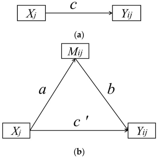 Multistep mediation analysis was used to decompose the effect of the built environment on physical health into a direct and mediating component as well as a total effect [103] (Figure 3). Figure 3a shows the path of the independent variable (Xj) to the dependent variable (Yij); the path coefficient is c (total effect of Xj on Yij). Figure 3b shows the relationship between the independent variable (Xj) and the dependent variable (Yij) after controlling the mediating variable (Mij), in which coefficient a represents the effect of the independent variable (Xj) on the mediating variable (Mij), and coefficient b represents the effect of the mediating variable (Mij) on the dependent variable (Yij). a × b is the mediating effect between the independent variable (Xj) and the dependent variable (Yij) when a∗b passes the statistical significance test. Additionally, the key of the multistep mediation analysis is to test the statistical significance of the mediating effect (a∗b). Coefficient c’ is the direct effect of the independent variable (Xj) on the dependent variable (Yij); The total effect of the independent variable on the dependent variable is equal to the direct effect plus the mediating effect (c = c’ + a × b).