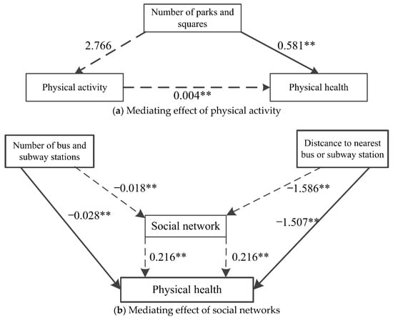 In addition, our results also confirm the mediating pathway of physical and social interaction activities between the built environment and the physical health of elderly individuals [42,88,89]. Physical activity has a partial mediating effect between the number of parks and squares and physical health. Social networks have a partial mediating effect between the number of bus and subway stations and the distance to the nearest station and physical health.
