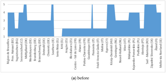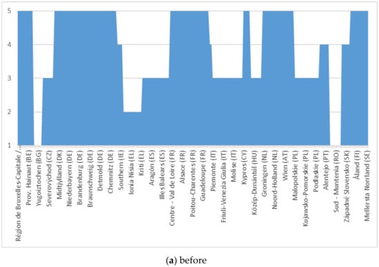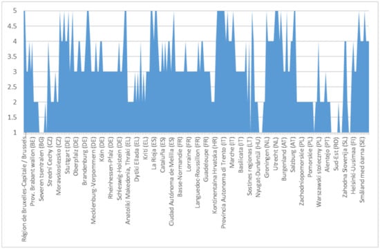 From Figure 2, it appears that the overall distribution is one in favour of medium efficiency, with a medium impact on performance. There are some situations (8 out of 10 regions) where the scalar level of the reliability indicator is very low, denoting a major impact on non-performance. These regions are located in the east of the EU.