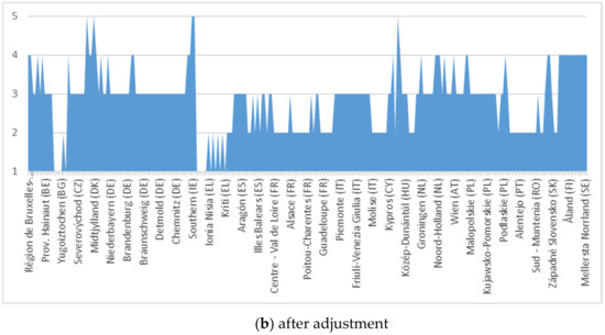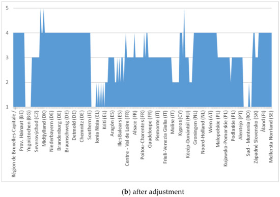 Following the analysis of the migration phenomenon through the lens of the proposed model, there is an increase in the impact of the phenomenon on European regions, especially on those with a low level of influence of the indicators in the initial (unadjusted) version. According to the figure, the trend is one of evenness/reduction in disparities, but towards the high impact area.