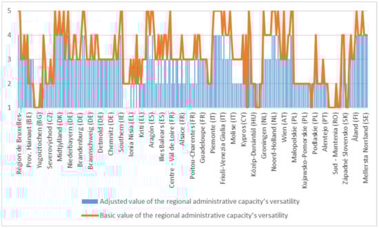 The composite value of the versatility indicator of regional administrative capacity in relation to the 3 disturbing phenomena (economic crisis, COVID-19 pandemic and migration) was calculated based on the 4 intermediate values, adjusted by rounded arithmetic mean to the value of the scalars defined in Figure 1, according to the formula: