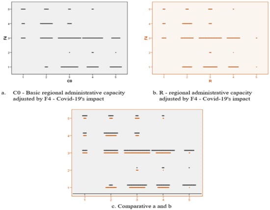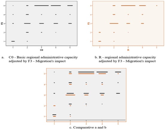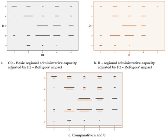 For the homogeneity of the analysis process, we used the same scale in Figure 3, so that our new model allows data parity. After estimating the data series (point “a” in Figure 5 and Figure 6), their adjustment was made regarding the impact on the versatility of regional administrative capacity through the analysed disturbance factor (internal migration + refugees).