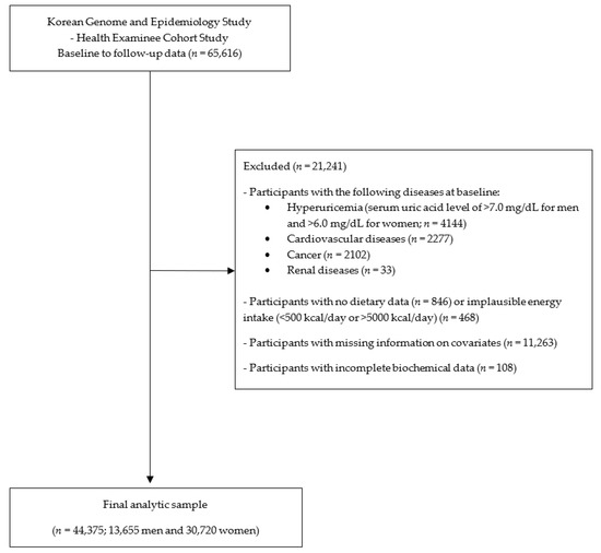 The Korean Genome and Epidemiology Study (KoGES) is a population-based prospective cohort study conducted by the Korea National Institute of Health [23]. The main objective of the KoGES was to evaluate the genetic and environmental factors associated with a variety of common diseases [23]. We used the KoGES Health Examinee (HEXA) cohort data, including those of urban residence participants aged ≥40 years. Baseline HEXA data were collected from 2004 to 2013 and the follow-up data from 2012 to 2016. There were 65,616 adults who participated in both baseline and follow-up examinations. We excluded participants who had hyperuricemia (serum uric acid level of >7.0 mg/dL for men and >6.0 mg/dL for women; n = 4144), cardiovascular diseases (n = 2277), cancer (n = 2102), and renal diseases (n = 33) at baseline. After the exclusion of participants with no dietary data (n = 846) or implausible energy intake (<500 kcal/day or >5000 kcal/day) (n = 468), missing information on covariates (n = 11,263), and incomplete biochemical data (n = 108), a total of 44,375 (13,655 men and 30,720 women) participants were finally included (Figure 1).