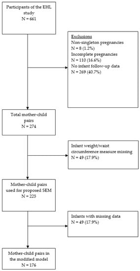 Mother–child pairs who had participated in a prospective birth cohort study—Growing Up in Wales: Environments for Healthy Living (EHL) [8,13], were included for the present study. Pregnant women were recruited from South Wales, United Kingdom, between November 2009 and March 2013. Briefly, after providing informed written consents, pregnant women over age 16 years old, receiving prenatal care within the Swansea Bay University Health Board (former Abertawe Bro Morgannwg University Health Board) area south of Wales, UK, were recruited to have face-to-face interviews at antenatal appointments. A one-off data collection visit was conducted during pregnancy and subsequent 12 month postnatal follow-up visit. The collected anthropometric, demographic, and questionnaire data included family characteristics, dietary intake, physical activity, and family-related variables. Postnatal data were also collected from both participant maternity notes and the parent-held child health records at the 12 month follow-up (including infant weight, length, and infant feeding method). With the consent, prenatal records, postnatal notes and routine electronic medical records were accessed via the Secured Anonymised Information Linkage Databank [14]. In total, 274 mother–child pairs were recruited for this study. A full description of participant involvement has been published elsewhere [8]. Inclusion criteria for the present study were: (1) availability of maternal demographics and anthropometric measures; (2) a singleton pregnancy; (3) no record of gestational diabetes mellitus (GDM); GDM increases the risk of adverse pregnancy and neonatal outcomes, and the risk of obesity in later life of both the mother and the child [15]. Treatment for GDM and potential exposure to diabetes in the uterus may introduce bias and unmeasured confounding variables to the whole sample in the present study. For this reason, women with GDM were excluded; and 4) no chronic health condition in the infant. Figure 1 shows how the inclusion criteria were applied to derive the sample for this analysis.