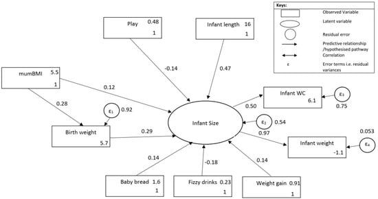 Infants vary in size and shape as much as adults do. Different anthropometric parameters were developed [20], weight and waist circumference are commonly used. In this paper, the study outcome, infant size, was a latent variable composed of a weight and waist circumference measure, obtained at the 12-month follow-up. Our model aimed to identify factors which were associated with a heavier infant with a larger waist circumference.