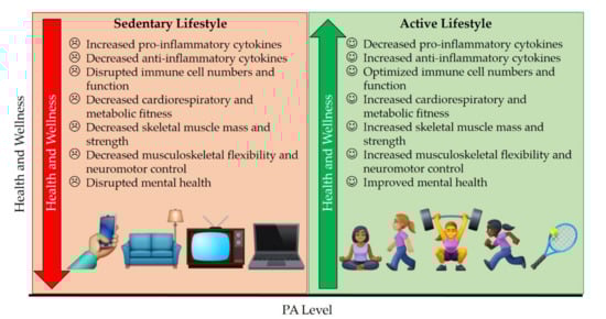 The emerging evidence suggests that patients who develop COVID-19 complications have an abnormal immune response [], which includes lymphocytopenia (in ~83%), thrombocytopenia (in ~36%), leukopenia (in ~33%), and elevated levels of c-reactive protein (CRP, in ~58%) [,]. Additionally, elevated pro-inflammatory cytokine levels, reduced interferon-γ (IFN-γ) levels, and reduced CD4+ and CD8+ T cells suggest that the immune system is dysregulated in COVID-19 with a positive correlation between severity of symptoms and the extent of dysregulation [,]. Many months after COVID-19 was considered a pandemic, promising therapeutic and prophylactic pharmacological agents received emergency authorization, but a cure per se has not yet been established. In this regard, PA as a nonpharmacological modality that can help to enhance the immune and musculoskeletal systems if performed safely at an optimal intensity and duration (Figure 1, Figure 2 and Figure 3).
