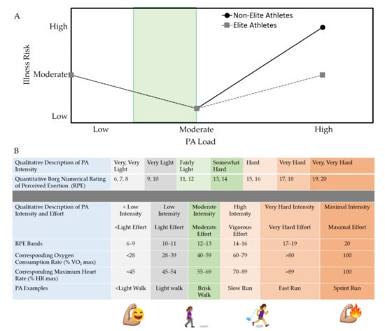 “Just Right” PA and reduction in overall illness risk. (A) Since there is a link between PA load (the combination of activity intensity and duration) and illness risk, it is important not to perform high loads of unaccustomed PA during the COVID-19 pandemic []. For the majority of women in the population whose physical ability level is not at the level of elite athletes, moderate PA is likely to be beneficial while unaccustomed, intense PA is likely to be harmful. Each individual should gauge for themselves, under the advice of suitable healthcare professionals, what their “just right” level of PA is (Green Zone in figure). For elite athletes, while setting PA load, the risk of illness must be weighed against the benefit of being able to return to a competitive level when COVID-19 restrictions are lifted. Furthermore, healthy elite athletes who are accustomed to high PA loads as part of systematic training have a lower risk of illness even with high PA loads. (B) Since the self-reported rating of perceived exertion (RPE) correlates well with VO2 max and HR, RPE is a simple yet reliable tool for gauging the intensity of PA and for adjusting PA load as needed [,].