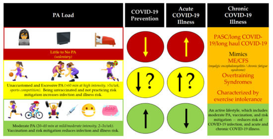 A worrisome hallmark of ME/CFS is PA intolerance, wherein even slightly excessive PA appears to exacerbate symptomatology or precipitate a relapse into chronic fatigue [,]. Curiously, overtraining syndrome mimics both ME/CFS and PASC, suggesting that overlapping neuro-inflammatory, autoimmune, and/or autonomic pathophysiological processes might be at play [] (Figure 3). Thus, the true paradox of PA and COVID-19 is that although mild to moderate regular PA may prevent or attenuate morbidity and mortality from COVID-19, once infected with SARS-CoV-2 and PASC develops, the positive health benefits of PA may be negated [,,,,]. Future longitudinal investigations are required to further dissect the effects of sex as a biological variable in the effect of PA as a preventive and/or remedial measure against acute and chronic COVID-19 illness. At present, it appears that in untrained individuals and in individuals with compromised PA tolerance, intense and fatiguing PA in the context of acute or chronic COVID-19 illness may be detrimental, but mild to moderate PA that is adjusted based on RPE might be beneficial for optimizing mental, physical, metabolic, and immune health (Figure 2 and Figure 3). As with ME/CFS, the most practical strategy to work through PASC might be to balance PA with intentional rest, avoid fatigue, pace daily routines, and resist the urge to “push oneself physically” on good days [,]. Additionally, due to the gravity of acute COVID-19 and PASC, it is highly recommended that women receive prophylactic pharmacological therapy against acute COVID-19 as early as possible (i.e., vaccination when eligible) and to continue to follow nonpharmacological physical risk mitigation measures (distancing, masking, hygiene, and self-isolation when sick) as part of maintaining an active lifestyle that prioritizes optimal PA (Figure 3).