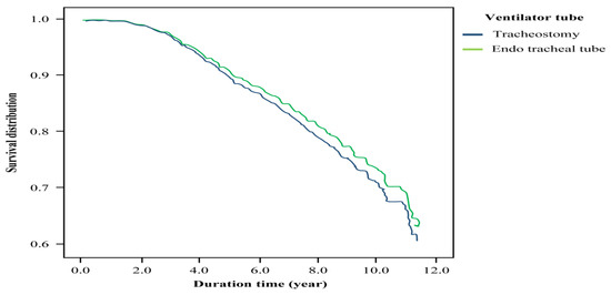 Altogether, we examined 1342 patients, among which 563 underwent tracheostomy, with 142 deaths, and 779 underwent translaryngeal intubation (using endotracheal tube), with 204 deaths. The total death toll was 346 (25.78%). The average survival was 4.98 years for patients with tracheostomy and 5.48 years for patients with translaryngeal intubation (Table 2), with no difference in mortality between the groups (Table 3). Sex, age, premium-based monthly salary difference, occupation, urbanization levels, COPD, CHF, chronic renal disease (CRD), and cerebrovascular diseases were statistically significant in the mortality of patients with endotracheal tubes (Table 3). In the Cox regression model, male sex (hazard ratio (HR): 1.29, 95% CI: 1.03–1.63), CHF (HR: 1.29, 95% CI: 1.02–1.63), and CRD (HR: 1.54, 95% CI: 1.10–2.14) were associated with higher mortality. Age >45 years was associated with higher mortality than age ≤45 years. Urbanization levels lower than the highest level were associated with lower mortality (Table 4). Although the total medical expenditure was higher for patients with tracheostomy than for laryngeal patients with endotracheal tubes, this was not the case for annual medical expenditures (Table 5). In the Kaplan–Meier survival curve, as shown in Figure 1 for the corrected survival curve of people using different breathing circuits, the observation time was >4 years, and patients with endotracheal tubes had a higher mortality risk than those with tracheal tubes.