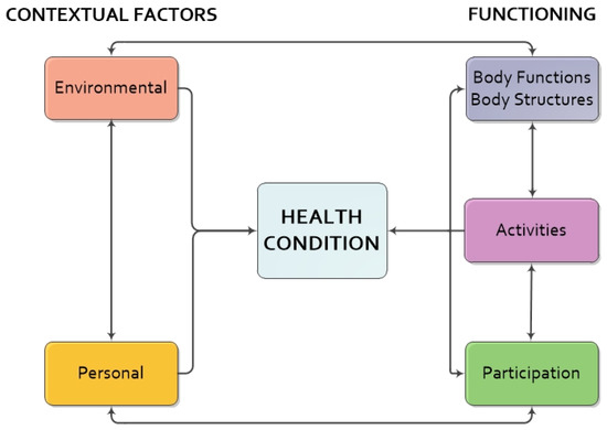 An approach that can help to achieve the objective of understanding the individual’s situation in a global context is the International Classification of Functioning, Disability and Health (ICF) framework. The ICF is a classification proposed and adopted in 2001 by the World Health Organization (WHO) as a comprehensive and universal measure of health and disability [12]. The ICF is based on a biopsychosocial model (see Figure 1) in which functionality and disability are conceived as a dynamic interaction between health states, composed of (a) Body functions and Body structures, (b) Activities and participation, and (c) Contextual factors, including Environmental and Personal factors [12].