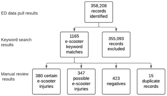 Provider notes from all patients treated during the study period were searched for the keywords related to use of e-scooters including: scooter, bird, byrd, lime, lyme, jump scooter, e-scooter, electric scooter, and “escooter”. These terms include the names of the companies operating e-Scooter fleets in the City of Atlanta during the study period as well as the terms “e-scooter” and “scooter” and common variations on the spelling of these terms. Records containing these keywords were then manually reviewed using the criteria in Table 1 and either identified as not being associated with an e-scooter or assigned a confidence level of either “certain” or “possible”.