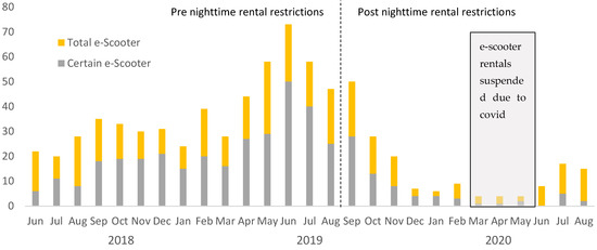 - Keenan, S.R. After Fourth e-Scooter Death, Atlanta Mayor Imposes Nighttime Dockless Vehicle Ban. Curbed Atlanta. 2019. Available online: https://atlanta.curbed.com/2019/8/8/20791741/e-scooter-death-atlanta-fatality-mayor-ban-night (accessed on 10 January 2021).
