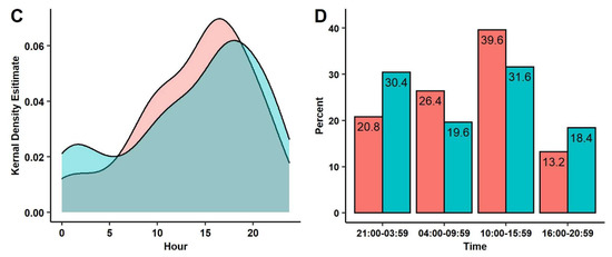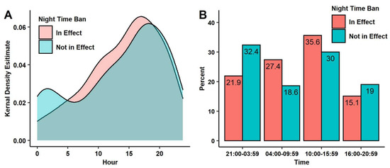 (A) A density plot depicting the distribution of arrival times for certain e-scooter patients as a function of the night time ban (12:00 a.m. is set to hour 0); the difference between the distributions was not significant (p = 23), (B) A bar graph depicting the percentage of certain scooter patients as a function of time of day and night time ban, the effect of the nighttime ban was not significant (p = 16), (C) A density plot depicting the distribution of arrival times for certain scooter patients transported by Emergency Medical Services (EMS) as a function of the night time ban; the difference between distributions is not significant (p = 0.18), (D) A bar graph depicting the percentage of certain scooter patients transported by EMS as a function of time of day and night time ban; the effect of the nighttime ban was not significant (p = 32).