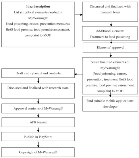 MyWarung© development began with an idea description, storyboard development, approval of contents by the research team, finalisation of contents in Android Package File (APK) format, publication in the Google PlayStore, and copyright acquisition from the Intellectual Property Corporation of Malaysia (MYIPO). Figure 2 depicts the overall development process for the MyWarung© mobile application. First, the workflow for producing a mobile app started with the idea description for preventing food poisoning. According to a recent study by Mu et al. [54], an ideal mobile app should be simple, flexible, and functional, and provide reliable information to the consumers. Furthermore, science-based and practice-based knowledge is necessary to provide appropriate guidance to consumers in changing their eating behaviours [54].