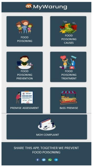 MyWarung© provides science-based information on food poisoning, including causative agents, symptoms, complications, causes, and prevention. However, science-based awareness alone is insufficient to change consumers’ ingrained daily habits [55]. Thus, MyWarung© offers practice-based information such as a list of BeSS (clean, safe, and healthy) food premises, food premise assessment as a guideline in selecting clean food handlers and food premise, and a platform to lodge a report directly to the Malaysian Ministry of Health when contracting food poisoning after dining out or coming across dirty food premises.