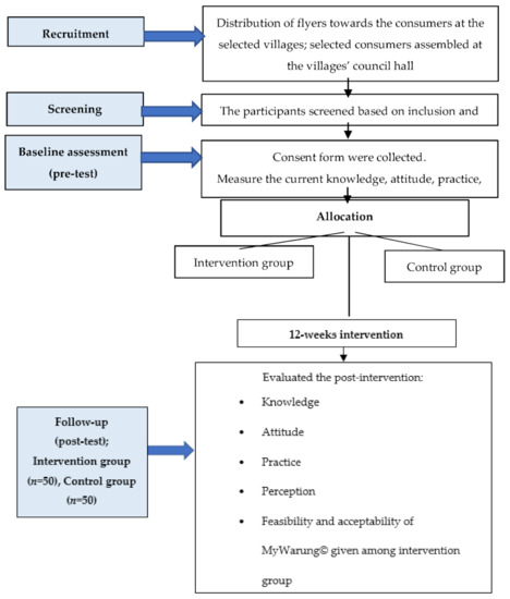 After 12 weeks of intervention, a text message containing a link to the post-intervention KAP2 Google form was sent to both groups to be completed [28]. The control group was later introduced to the MyWarung© app for ethical reasons after all the respondents had submitted the post-intervention KAP2 questionnaire [34,64]. Each respondent was gifted with a token of appreciation upon completing the questionnaire.