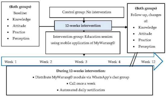 Tong et al. [68] stated that 16 reviews used a 12-week intervention period to yield significant outcomes in the intervention group relative to the control group. In addition, several intervention studies showed significant improvements in preventive behaviour after implementing a 12-week intervention duration [34,69,70,71]. As a result of the significant improvement and its suitability to the number of modules offered in the MyWarung© app, the current study adopted a 12-week educational period for respondents. Nevertheless, a longer intervention duration could be more effective because it is reasonable to assume that the longer the interventional duration, the more respondents might learn and change their habits.