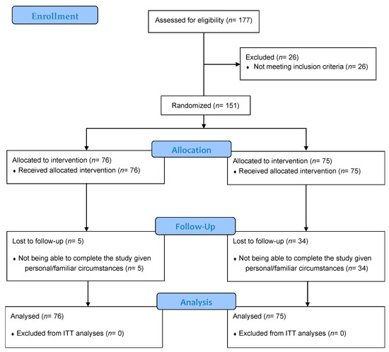- Schulz, K.F.; Altman, D.G.; Moher, D.; CONSORT Group. CONSORT 2010 Statement: Updated guidelines for reporting parallel group randomized trials. Ann. Int. Med. 2010, 152, 726–732. [Google Scholar] [CrossRef]