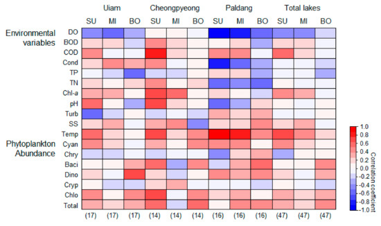 Correlation between geosmin and phytoplankton abundance and environmental variables. The color gradient (from −1 to 1) indicates Spearman’s correlation coefficients. The darker red indicates a higher positive correlation (p < 0.05), and darker blue indicates a higher negative correlation (p < 0.05). The numbers in parenthesis indicate the number of sampling sizes. Abbreviation of each variable indicated in Table 2. SU: surface layer, MI: middle layer, BO: bottom layer, and Total lake: pooled sample in each layer from three lakes.