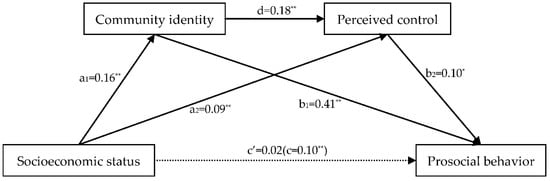 After standardizing all variables, socioeconomic status was taken as an independent variable, prosocial behavior as a dependent variable, and community identity and perceived control as mediating variables. Using PROCESS software for SPSS22.0 (Model 6) [], the present study examined the serially mediating role of community identity and perceived control between socioeconomic status and prosocial behavior. As shown in Figure 2, the results showed that socioeconomic status was positively related to prosocial behavior (c) and community identity (a1); both socioeconomic status (a2) and community identity (d) were positively related to perceived control; meanwhile, community identity (b1) and perceived control (b2) were both positively related to prosocial behavior. However, socioeconomic status was not directly related to prosocial behavior (c’).