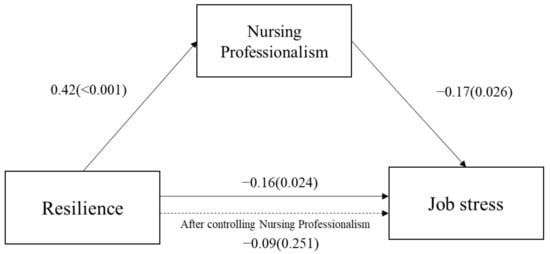 Table 4 presents the regression analysis results conducted to verify the mediating effects of nursing professionalism on the relationship between resilience and job stress levels. In the first step of the analysis, resilience was treated as an independent variable, and nursing professionalism was treated as a mediator variable. A significant effect was found between resilience and nursing professionalism (β = 0.42, p < 0.001). In the second step, the results of the regression with resilience (independent variable) and job stress levels (dependent variable) were statistically significant (β = −0.16, p = 0.024). In the third step, resilience (independent variable) and nursing professionalism (mediator variable) were simultaneously introduced into the regression model to predict job stress levels (dependent variable). The analysis revealed that nursing professionalism had a significant effect on job stress levels (β = −0.17, p = 0.026). However, the absolute value of the regression coefficient, the effect of resilience on job stress levels, declined from –0.16 to –0.09 and was not statistically significant (β = −0.09, p = 0.251). Therefore, nursing professionalism can be interpreted as completely mediating the relationship between resilience and job stress levels, as seen in Figure 1. Additionally, a Sobel test was performed to verify the significance of the mediating effects of nursing professionalism; the mediating effects on the relationship between resilience and job stress levels were found to be significant (Z = −2.12, p < 0.05).