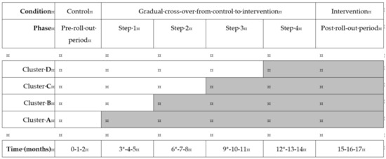 - Hemming, K.; Haines, T.; Chilton, P.J.; Girling, A.; Lilford, R.J. The stepped wedge cluster randomised trial: Rationale, design, analysis, and reporting. BMJ 2015, 350, h391. [Google Scholar] [CrossRef]